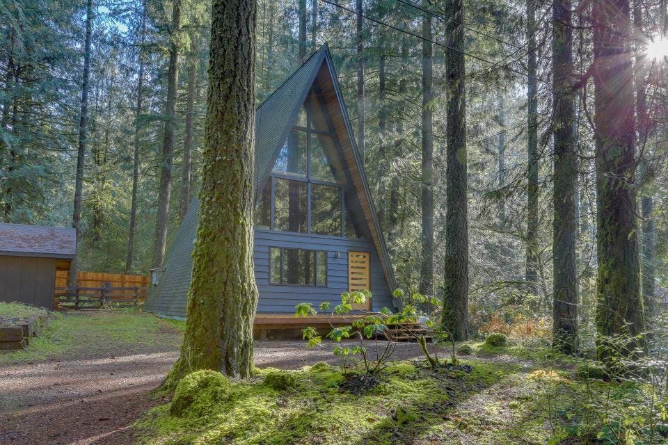 /This gorgeous a-frame is what I want when I say that I yearn for a cozy cabin in the woods. Maybe one day.