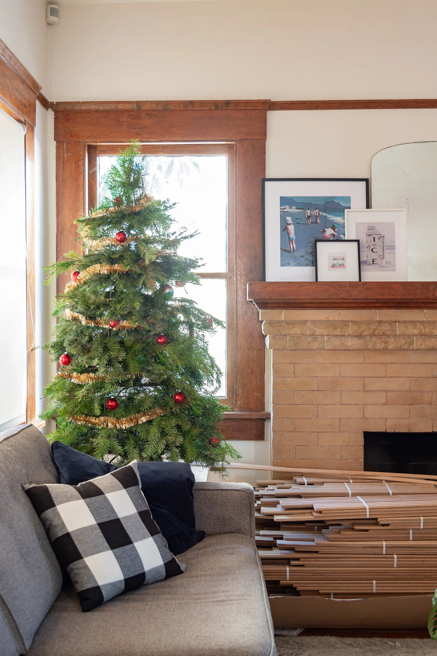 Years ago I just threw a bunch of greenery on top of the chandelier in the dining room. It took little effort and they just balance on the light fixture. I had more leftover so I piled them on the built-in, too. You could do this on a mantel without buying the pre-made garland.