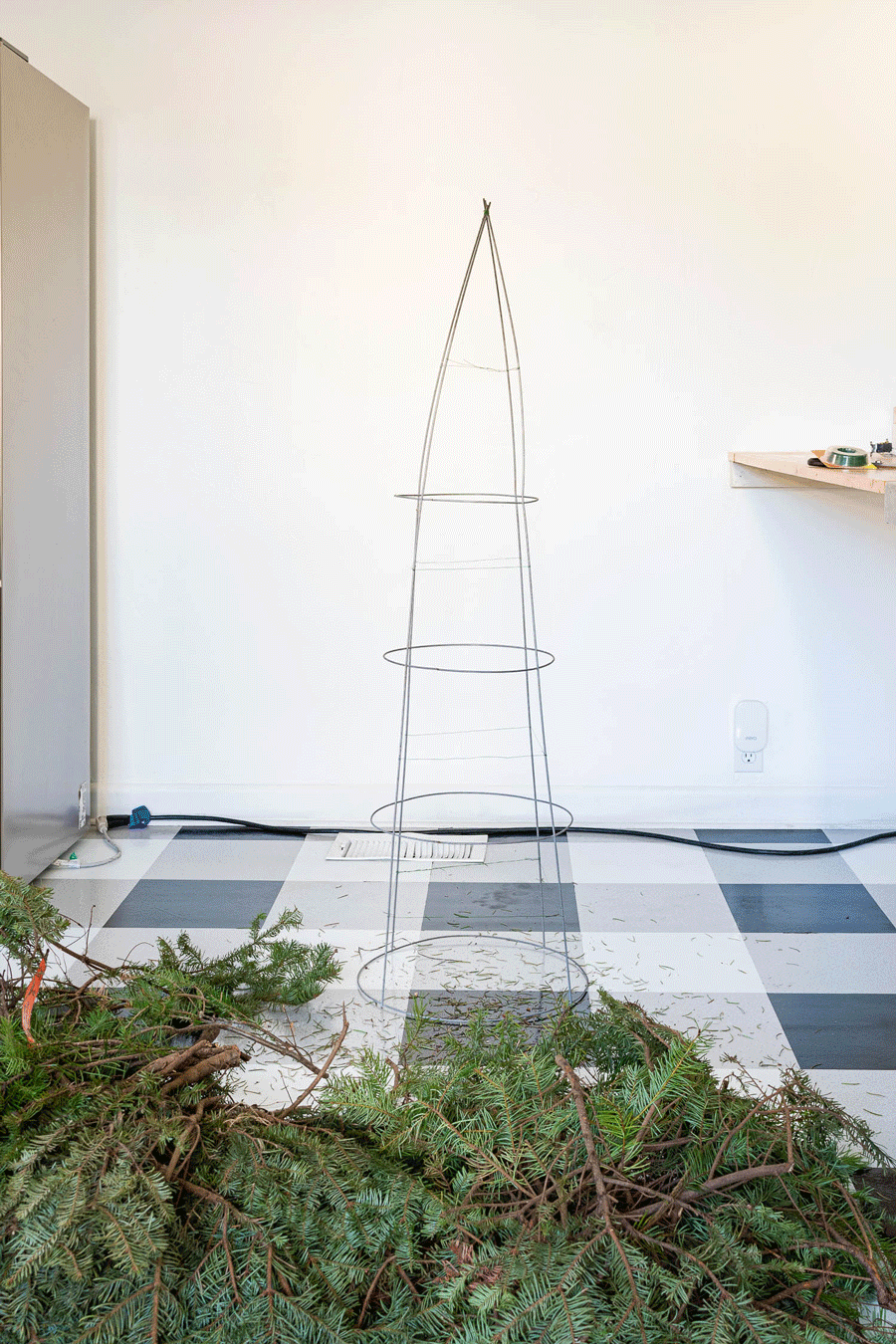Start on the first wire support at the bottom by adding the larger boughs with the ends heading into the body of the cone shape. Insert at least one on each of the four sides. As you go, you can hook the cut end of the branch under the wire or under another branch to support it. (I skipped the very bottom one to make it easier to transport to another room but you could add more at the bottom at the end)