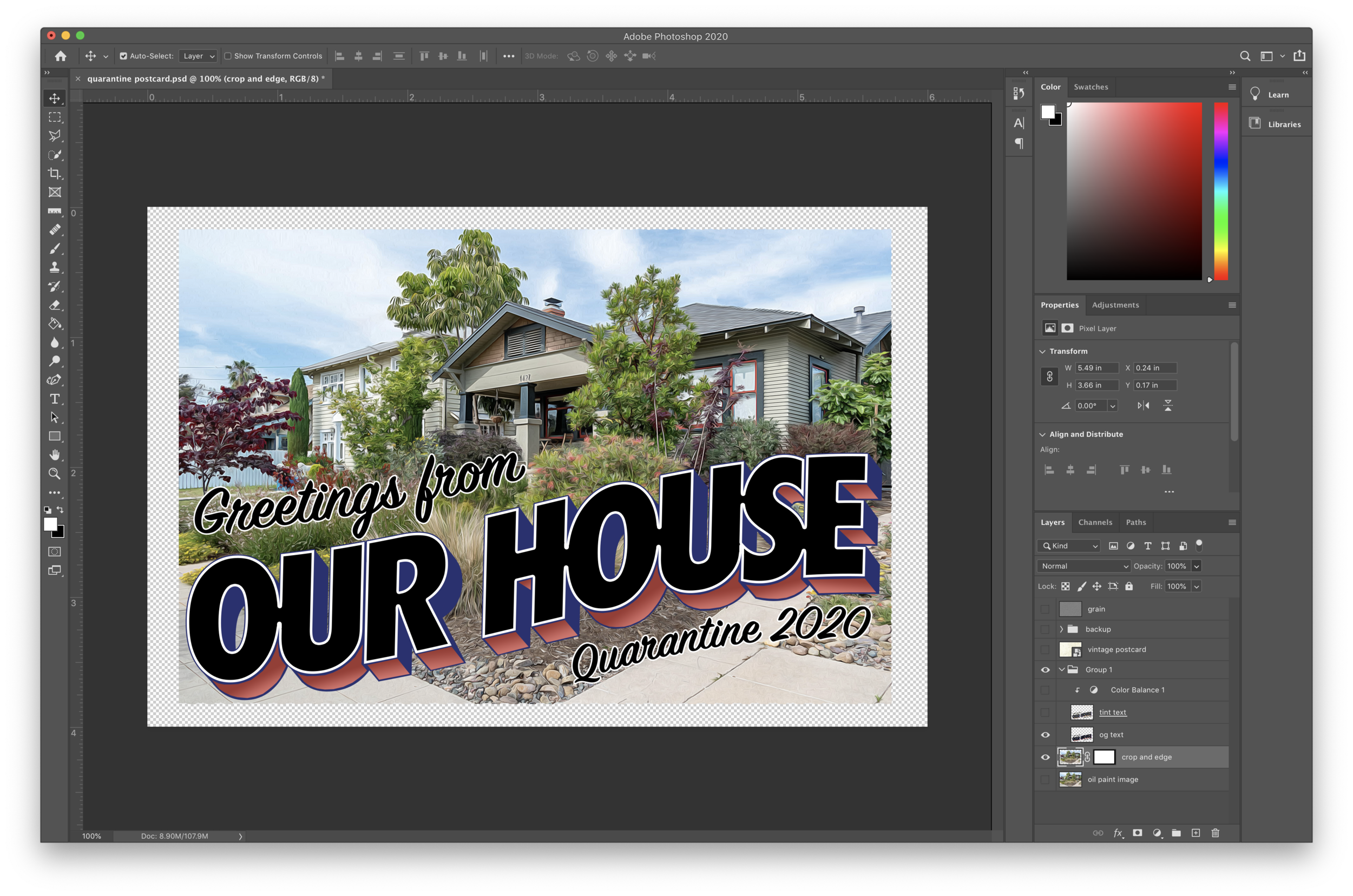 I started with an image of the exterior of my house that I already had. It helps that I had some empty space near the bottom and I like that the shot captures an angle of the house. I think it makes it more dynamic and more akin to the retro design. But, if you’re going to take a photo just for this project, I’d recommend taking a photo knowing that you’re going to superimpose a bunch of text on it. You can pre-design the shape and orientation of the text before taking the photo for the best framing results. And of course, the photo doesn’t need to be the exterior of the house. It could be a photo of your apartment front door, your balcony, the entrance of your yurt, or the view from your house boat!