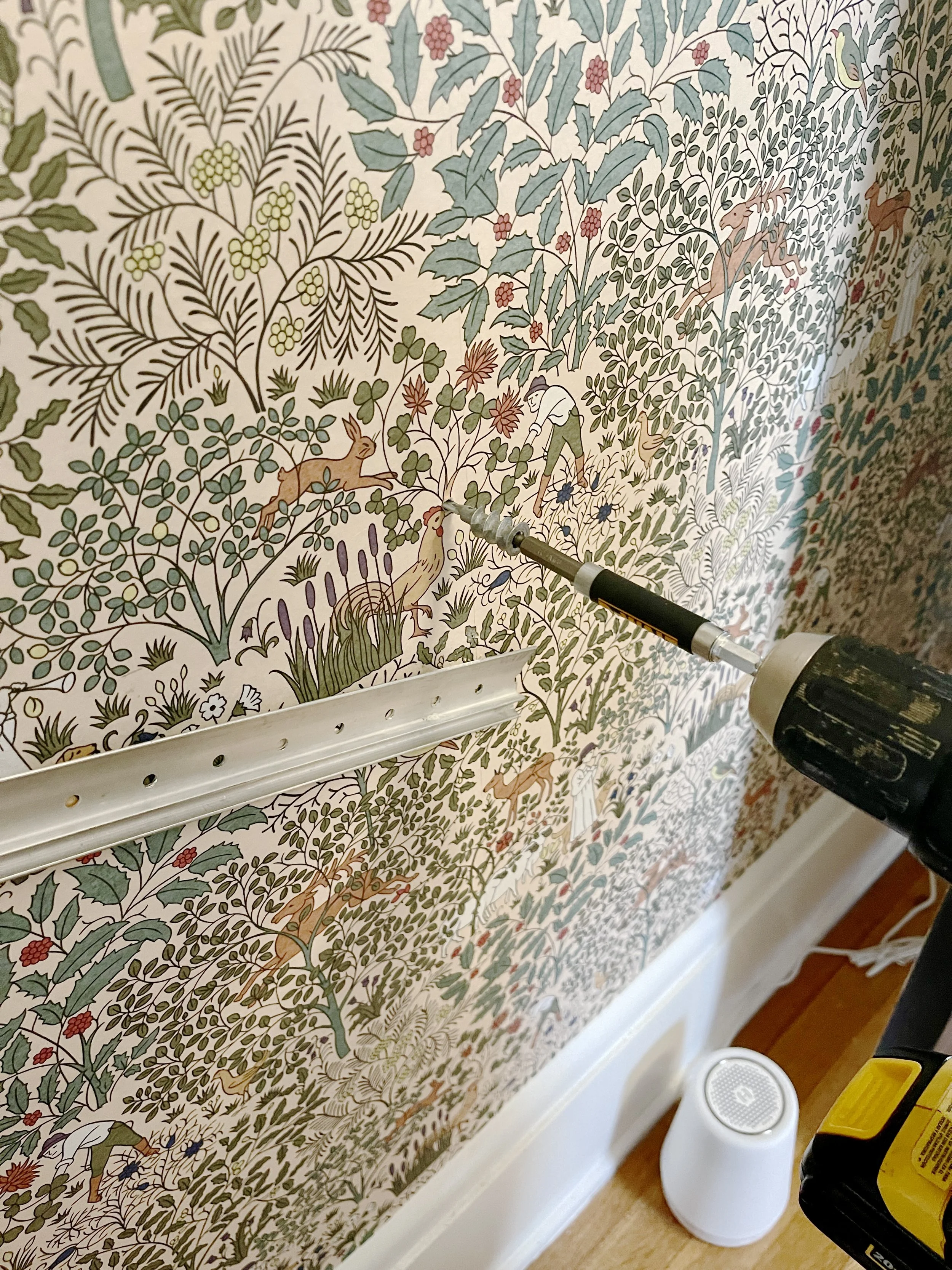 We installed it using a metal cleat system and metal anchors. The typical plastic anchors don’t work in lath and plaster walls, so I only ever use metal ones. I’ll admit that they are finicky and sometimes make matters worse, but after a few failed attempts, we got everything in place. The heavy bookcase is thoroughly supported with a screw in a stud, another screw in the metal anchor, and with the weight distributed on a metal cleat. You can never be too safe with mounting heavy objects to walls.